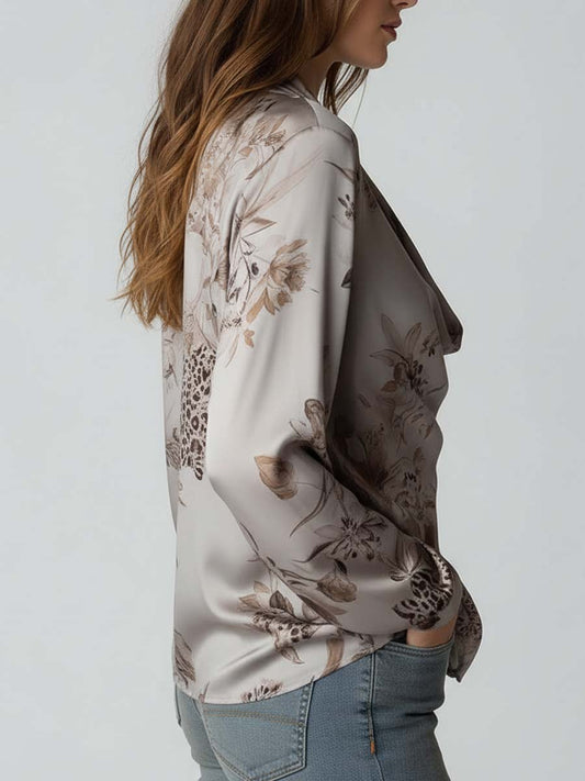 Vintage Leopard Print Floral Cowl Neck Polyester Satin Blouse